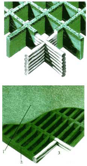 Continuous fiberglass roving is placed in the open, heated mold in alternating layers, wetted out thoroughly with resin. Such a process produce an integral, one- piece construction, which offers excellent corrosion resistance and bi-directional strength as well.